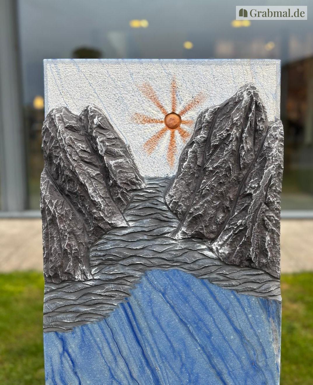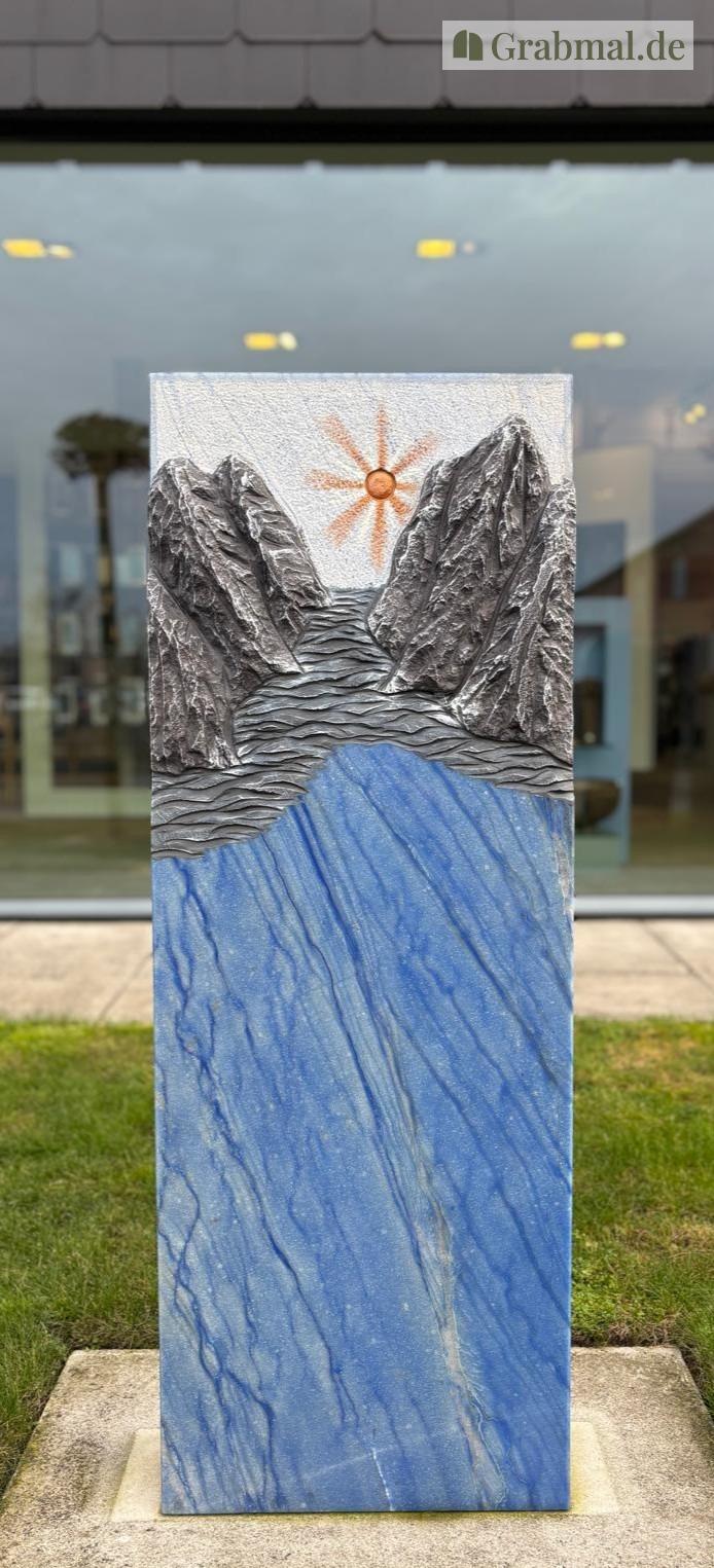 Besondere Grabmalstele aus dem Material Azul Macaubas. Dieses, aus Brasilien stammende, Material hat einen besonders intensiven blau schimmernden Farbton und ist sehr fest in seiner Struktur. Das Ornament ist bereits enthalten.