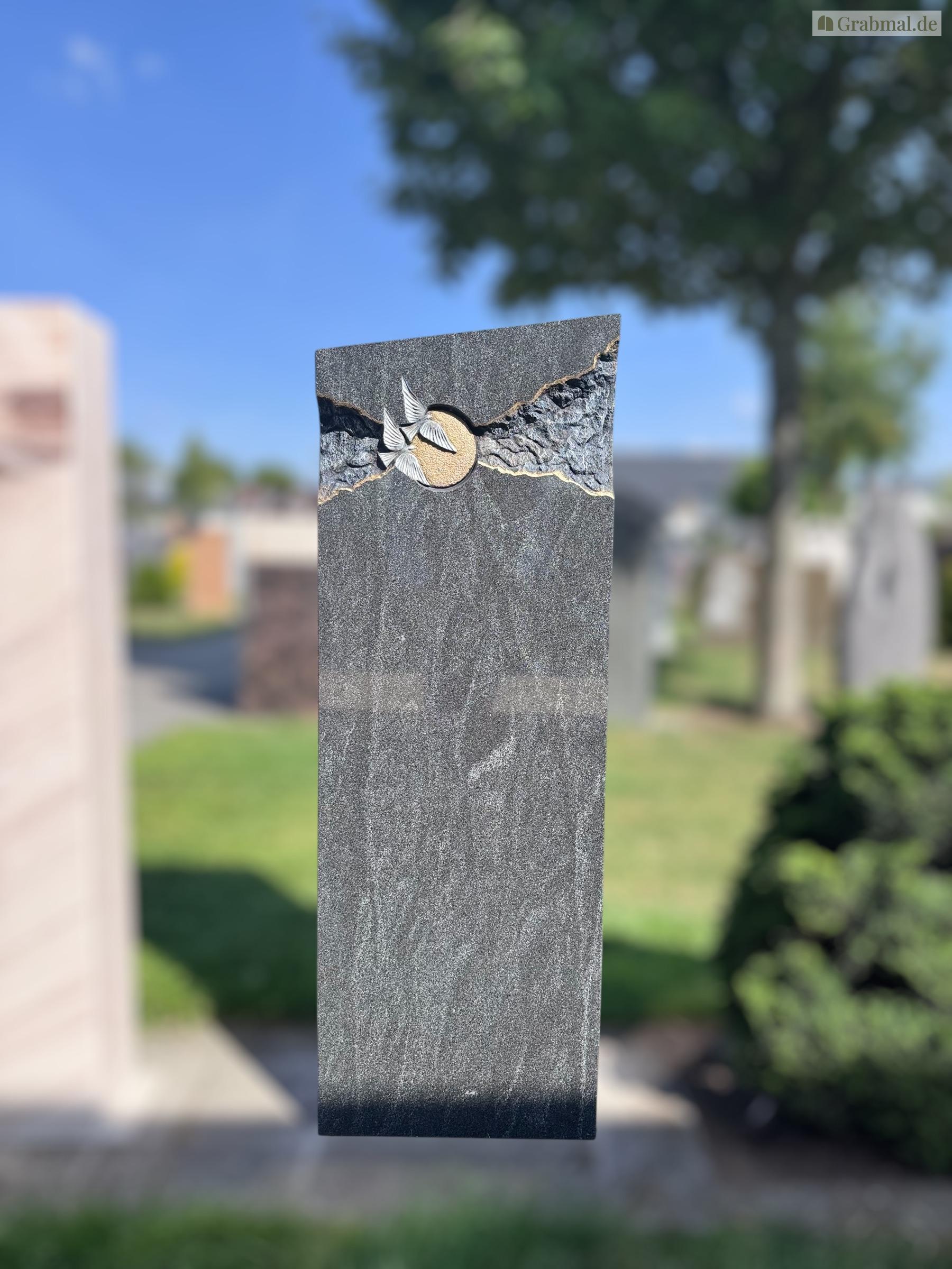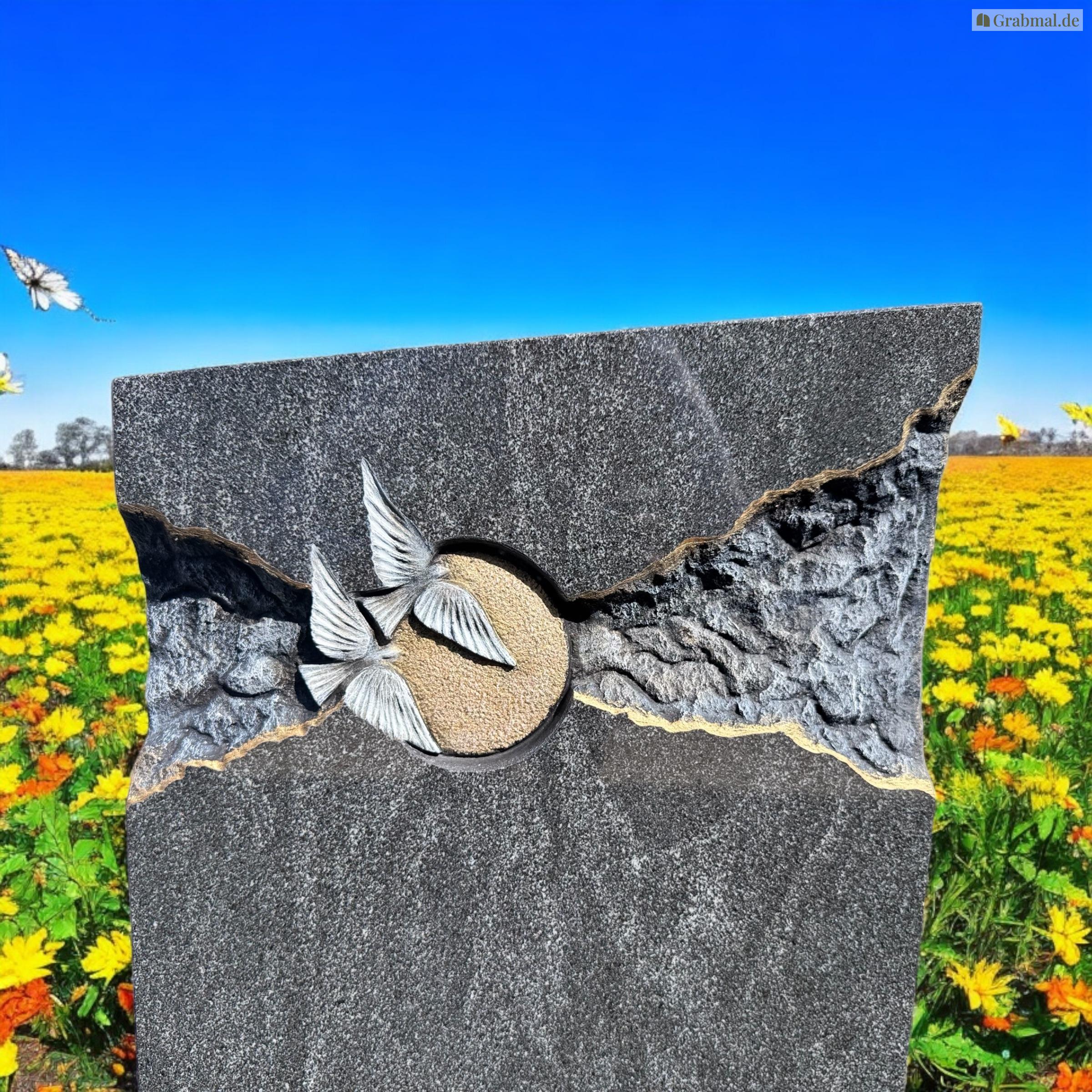 Hochwertiges Grabmal aus dem Material Virginia Black mit eindrucksvoller Handwerksarbeit. Symbolisch fliegen die Vögel zum Himmel.