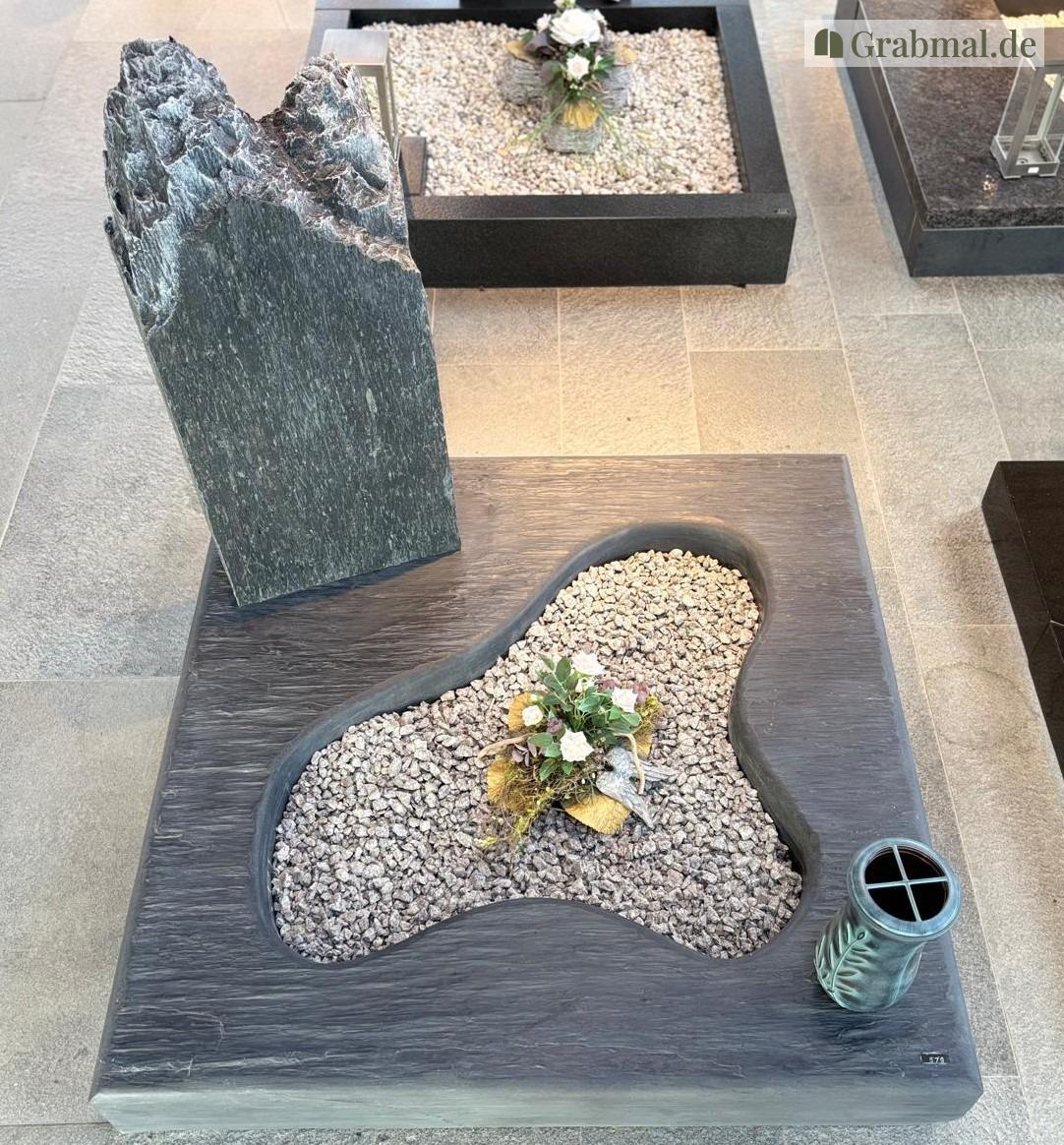 Schieferabdeckung mit Ausschnitt und Serpentinfelsen, zzgl. Bronzevase