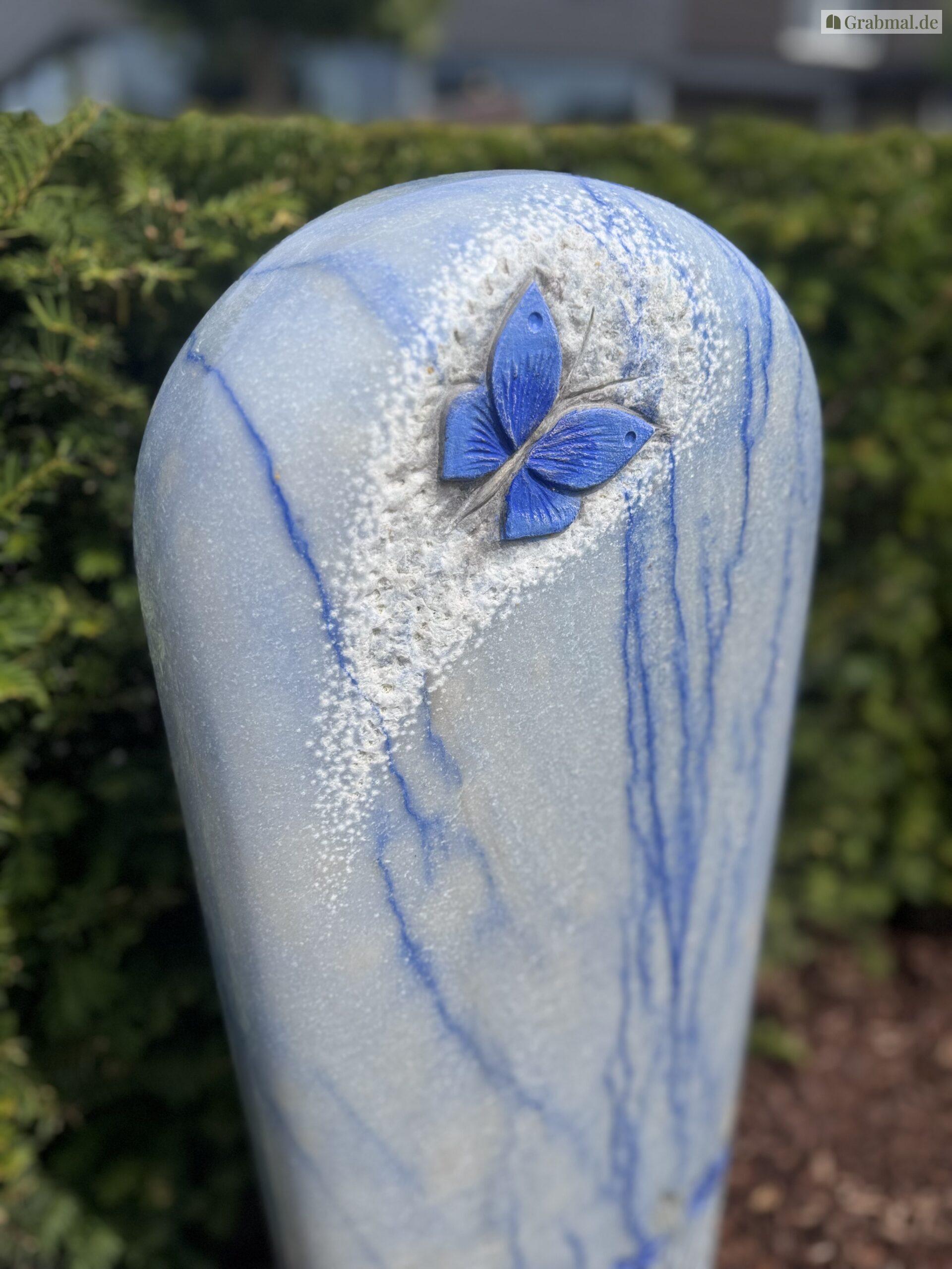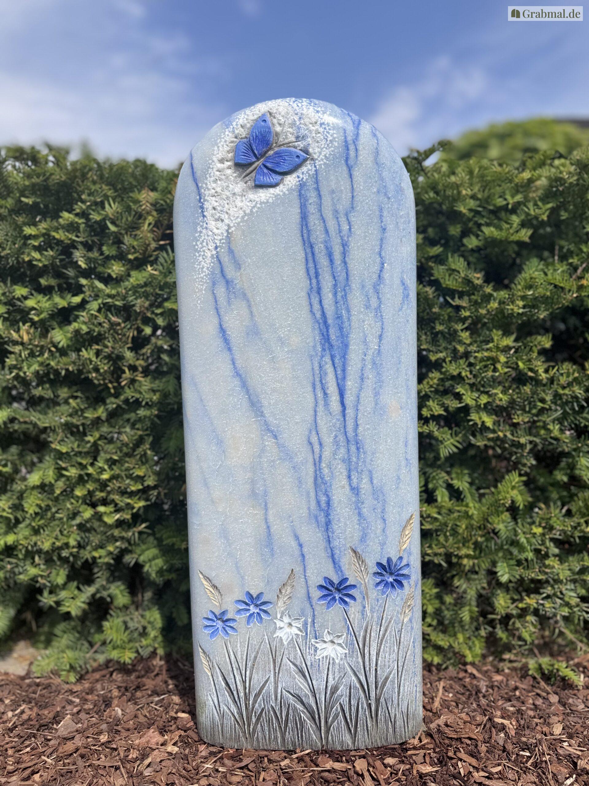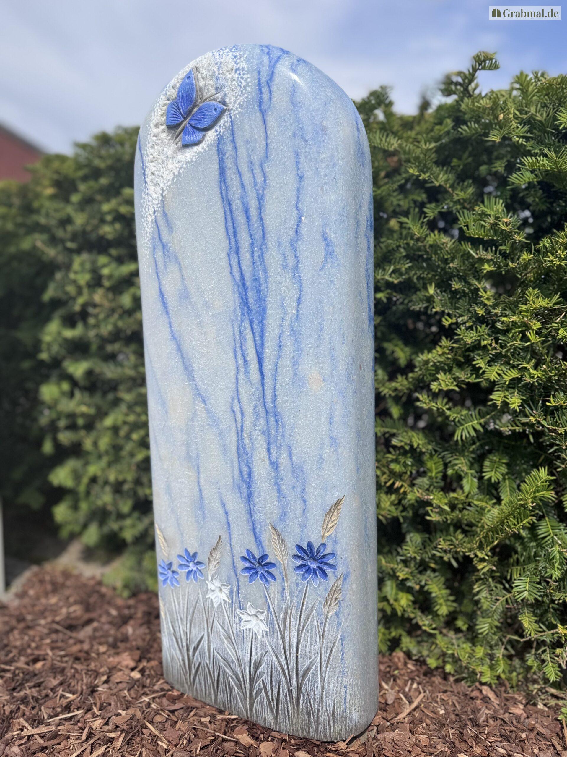 „Azul Macaubas“ ist ein einzigartiger Naturstein mit einer intensiven, himmelblauen bis tiefblauen Grundfarbe, durchzogen von feinen weißen und grauen Adern. Diese außergewöhnliche Farbgebung erinnert an fließendes Wasser oder einen weiten, klaren Himmel und verleiht jedem Grabmal eine besondere Ausdruckskraft und Symbolik.
