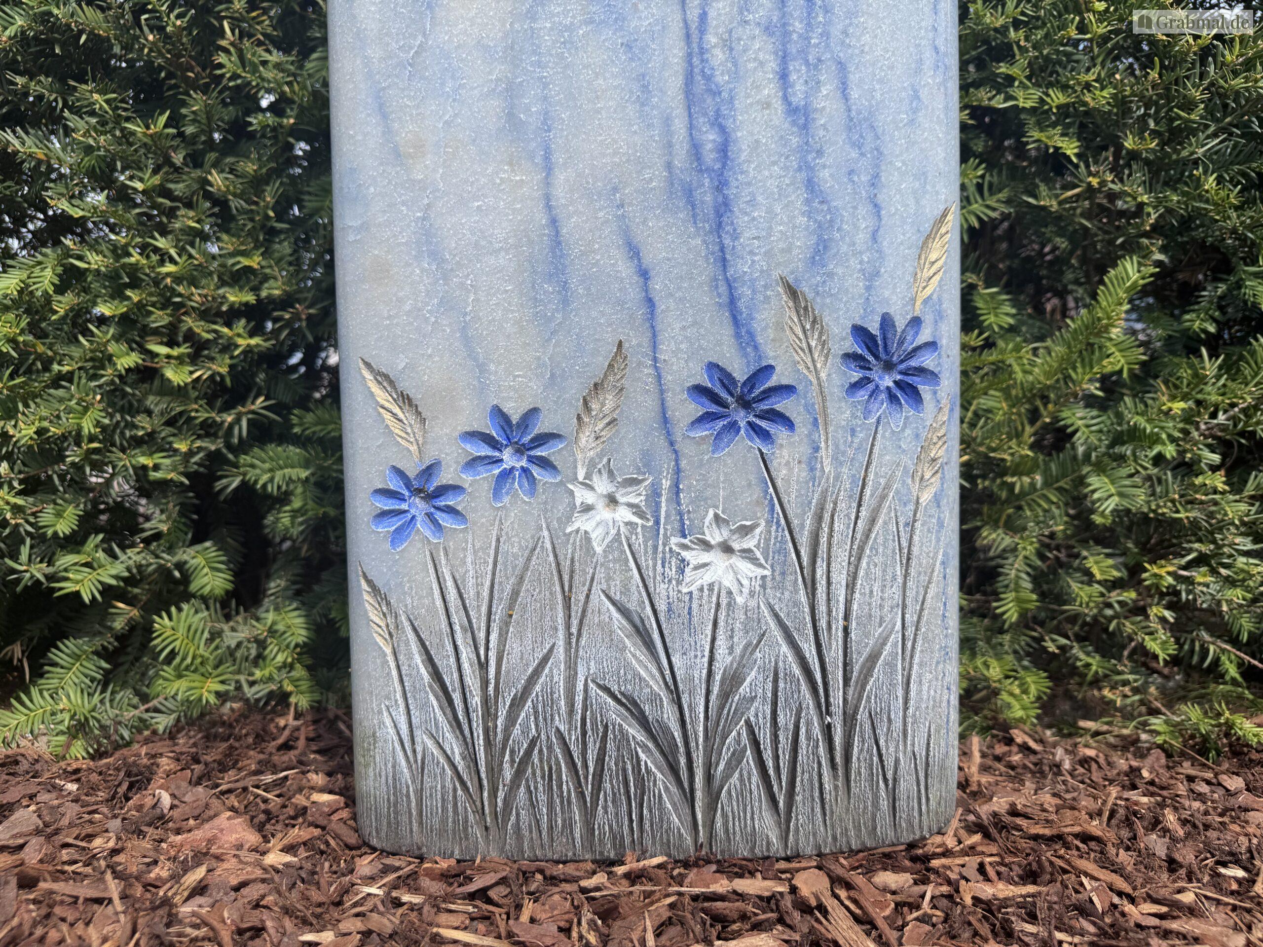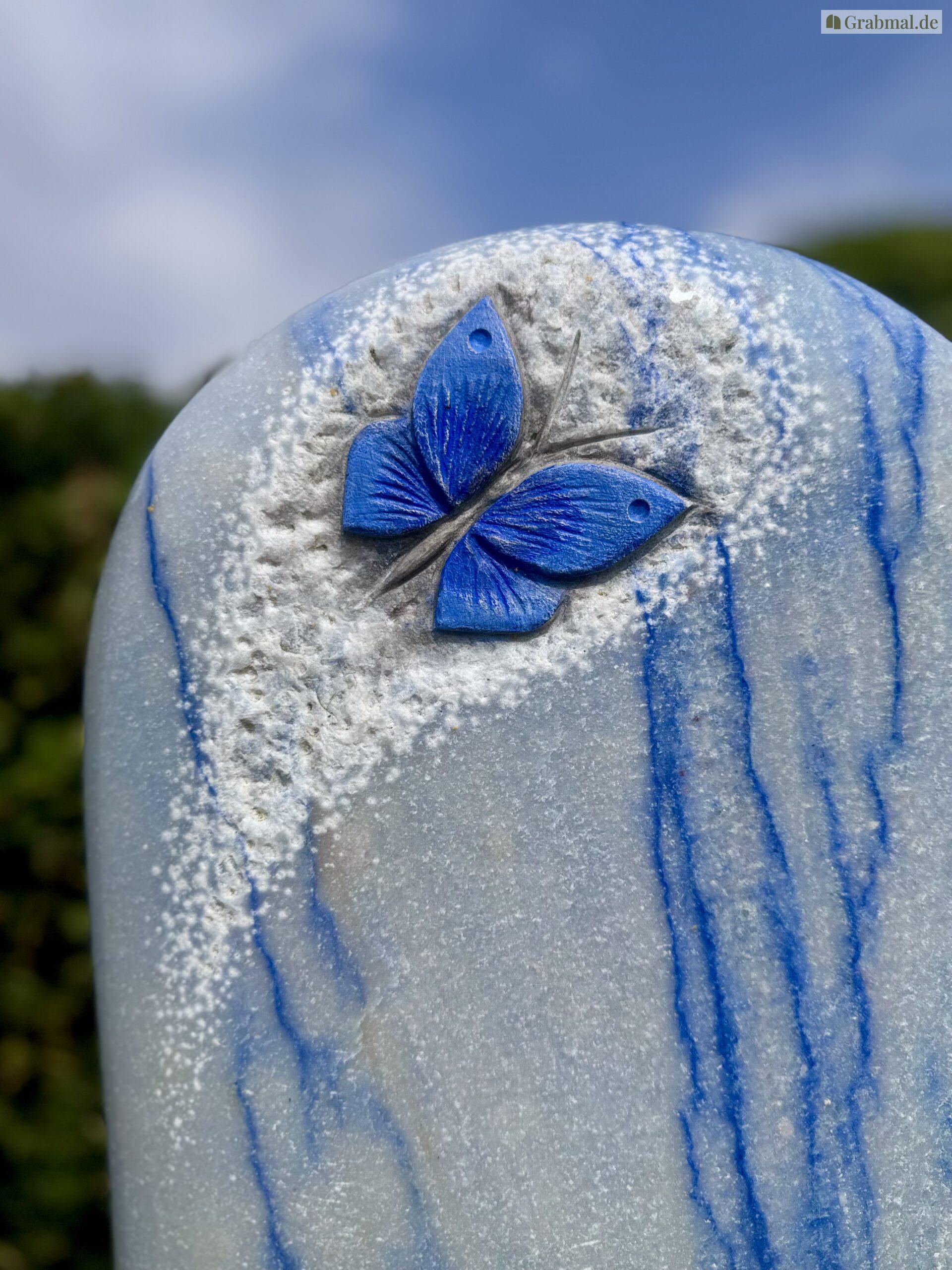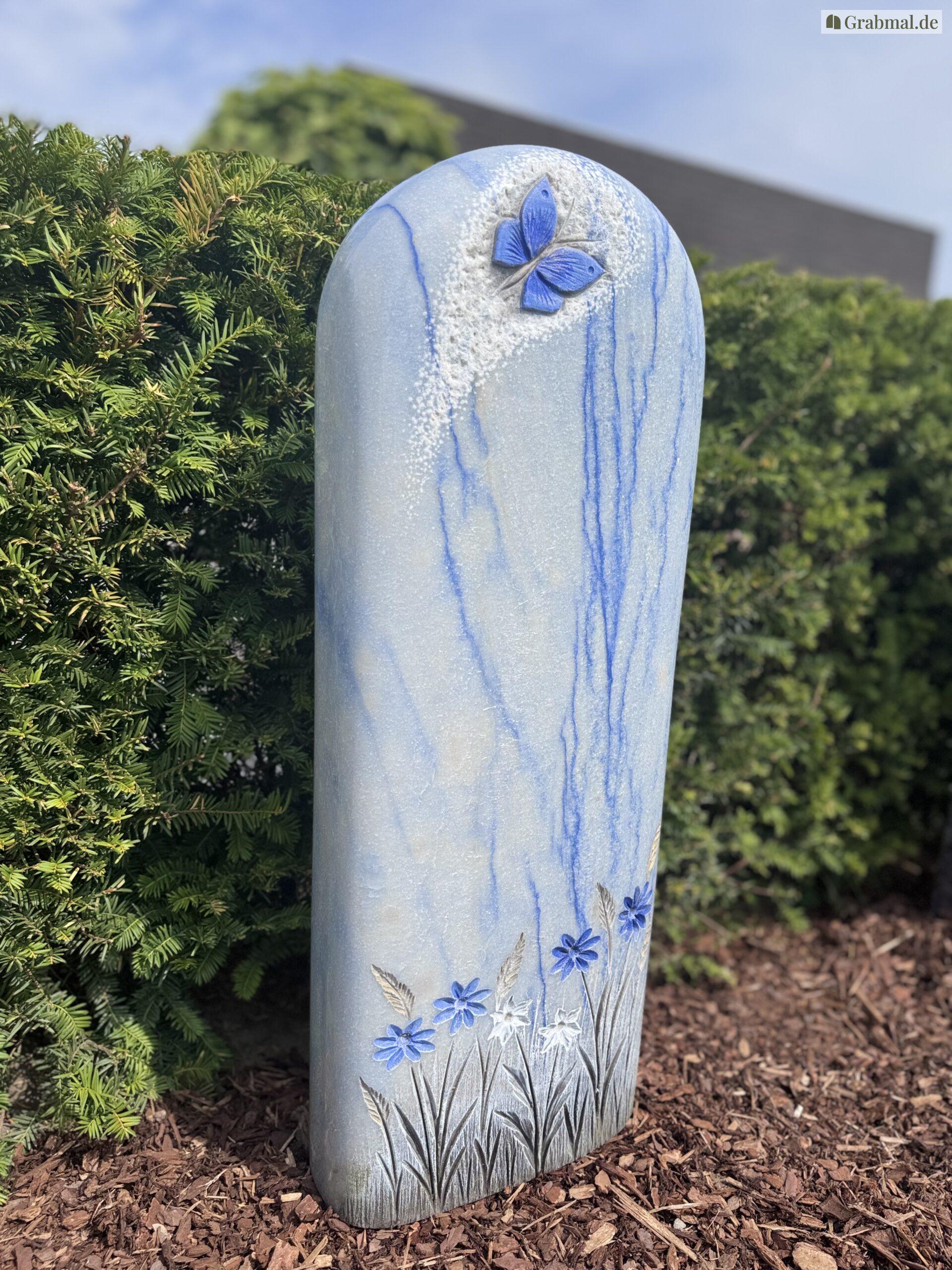 „Azul Macaubas“ ist ein einzigartiger Naturstein mit einer intensiven, himmelblauen bis tiefblauen Grundfarbe, durchzogen von feinen weißen und grauen Adern. Diese außergewöhnliche Farbgebung erinnert an fließendes Wasser oder einen weiten, klaren Himmel und verleiht jedem Grabmal eine besondere Ausdruckskraft und Symbolik.